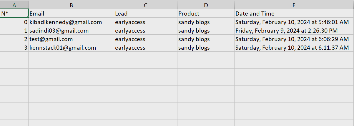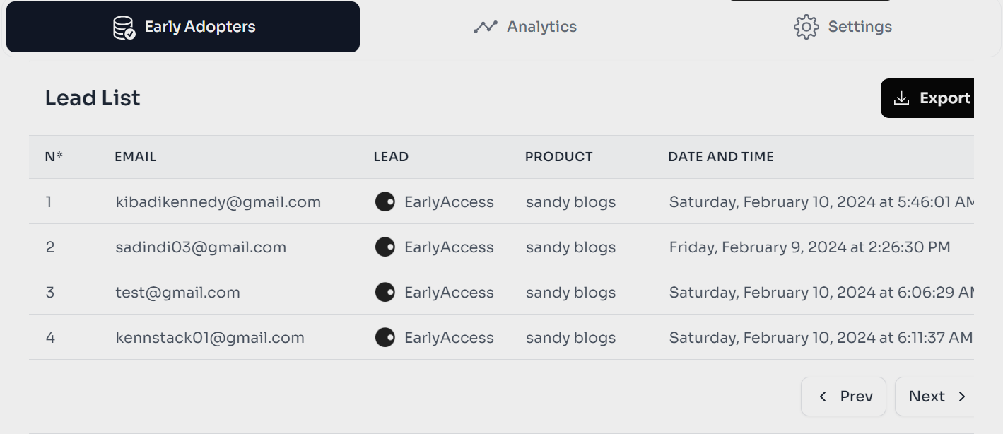 To test the EarlyAccess waitlist feature, begin by adding emails in the Join the Waitlist section on the landing page.